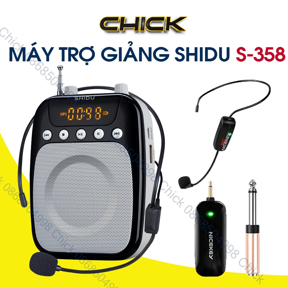 **1. Lựa chọn:** - SHIDU không dây: 1 máy, 1 micro không dây UHF - SHIDU có dây: 1 máy, 1 micro có dây **2. Đặc điểm nổi bật:** - Công suất loa: 10W, không gian: 50-80m2 - Thời gian sạc: 4h, sử dụng: 15h - Hỗ trợ FM, ghi âm, màn hình LED - Hỗ trợ thẻ nhớ, USB, file MP3, WMA **3. Trọn bộ sản phẩm:** - Máy trợ giảng SHIDU SD-S358 - Micro không dây FM - Micro có dây - Phụ kiện: Cáp sạc USB, dây đeo, sách hướng dẫn, phiếu bảo hành **4. Chính sách bảo hành:** - Cam kết hàng chính hãng - Bảo hành 12 tháng, đổi 1-1 trong 3 ngày - Ship COD, hotline: 0868.504.998