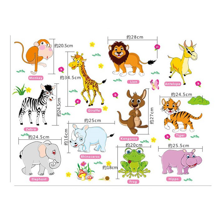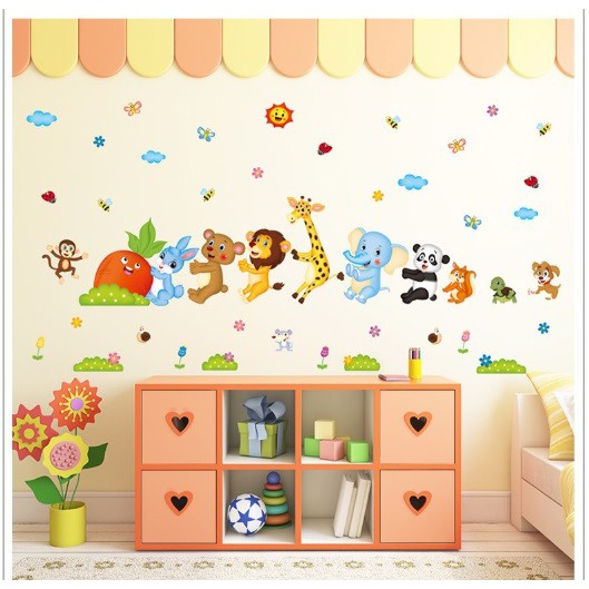 Decal dán tường động vật ngộ nghĩnh cho bé, kích thước tùy chỉnh 1m2, chất liệu giấy bóng có keo dán.